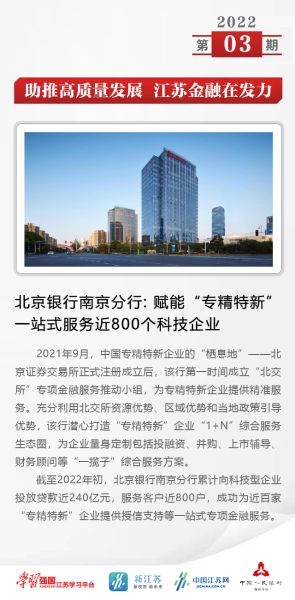 截至2022年初,北京银行南京分行累计向科技型企业投放贷款近240亿元,服务客户近800户,成功为近百家“专精特新”企业提供授信支持等一站式专项金融服务。