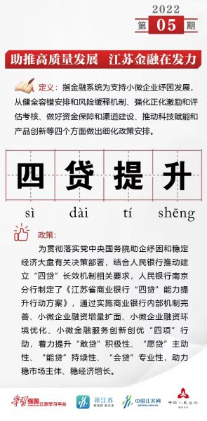 编者按:金融活,经济活;金融稳,经济稳。为进一步激发江苏金融活力,汇聚更多发展能量,由中国人民银行南京分行指导,“学习强国”江苏学习平台、中国江苏网、新江苏客户端联合推出《助推高质量发展 江苏金融在发力》特别策划,解读当下金融热词,介绍各机构生动实践,助力推动江苏金融高质量发展营造良好生态,以实际行动迎接党的二十大胜利召开。本期聚焦“四贷提升”,一图了解江苏在四贷提升工作实践中的高招、实招。