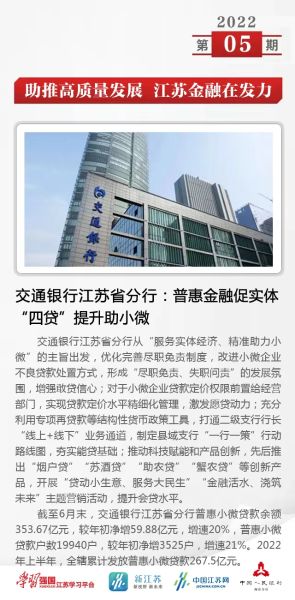 截至6月末,交通银行江苏省分行普惠小微贷款余额353.67亿元,较年初净增59.88亿元,增速20%,普惠小微贷款户数19940户,较年初净增3525户,增速21%。2022年上半年,全辖累计发放普惠小微贷款267.5亿元。
