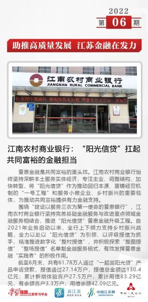 普惠金融是共同富裕的重头戏。江南农村商业银行始终坚持深耕本土服务实体经济,专注主业、调整结构、加快转型,将“阳光信贷”作为推动回归本源、重铸经营机制的“一号工程”和服务小微企业、乡村振兴的重要载体,为推动共同富裕提供有力金融支持。