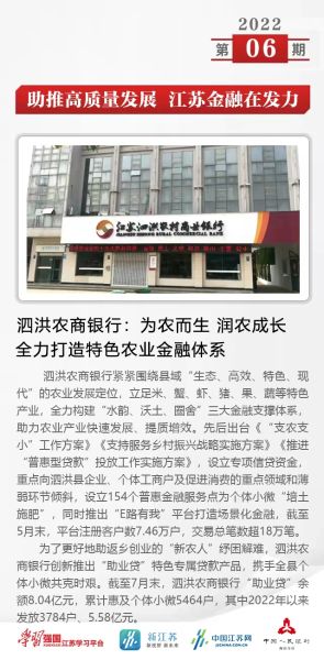 泗洪农商银行紧紧围绕县域“生态、高效、特色、现代”的农业发展定位,立足米、蟹、虾、猪、果、蔬等特色产业,全力构建“水韵、沃土、圈舍”三大金融支撑体系,助力农业产业快速发展、提质增效。先后出台《“支农支小”工作方案》《支持服务乡村振兴战略实施方案》《推进“普惠型贷款”投放工作实施方案》,设立专项信贷资金,重点向泗洪县企业、个体工商户及促进消费的重点领域和薄弱环节倾斜,设立154个普惠金融服务点为个体小微“培土施肥”,同时推出“E路有我”平台打造场景化金融,截至5月末,平台注册客户数7.46万户,交易总笔数超18万笔。