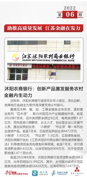 围绕花木种、销、加、工等全链条主体需求,适时推出系列“花木贷”,助力沭阳花木产业链提档升级。截至2022年7月末,花木类贷款余额达9亿元,电商类贷款1.87亿元;面向各类小微群体、乡土人才、创业型企业以及留守人员,推出富民创业贷,“小微贷”“市企贷”等一系列创业信贷产品。截至7月末,已投放富民创业贷4472万元、“小微贷”3.92亿元、“市企贷”1.3亿元;立足绿色金融,沭阳农商银行出台《江苏沭阳农村商业银行绿色信贷管理办法》引导信贷资金流向绿色环保领域。截至7月末,该行绿色贷款余额4.42亿元,比年初增加6006万元,高于各项贷款增速2.47个百分点。